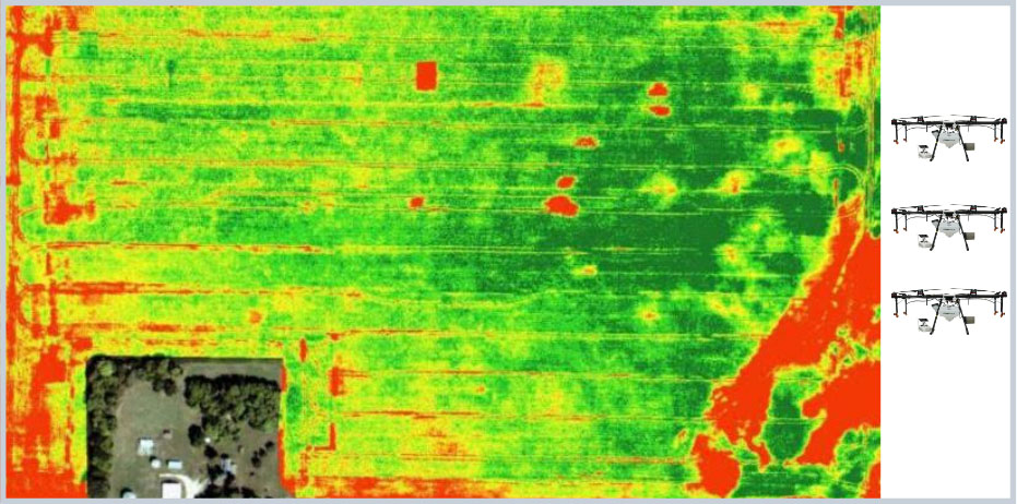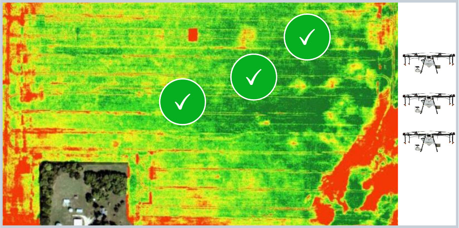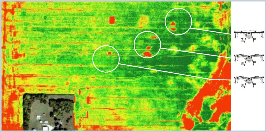 Imagens de campo de alta resolução com a utilização de drones agrícolas, aviões, satélite ou reconhecimento de campo identificam as áreas problemáticas (em vermelho).